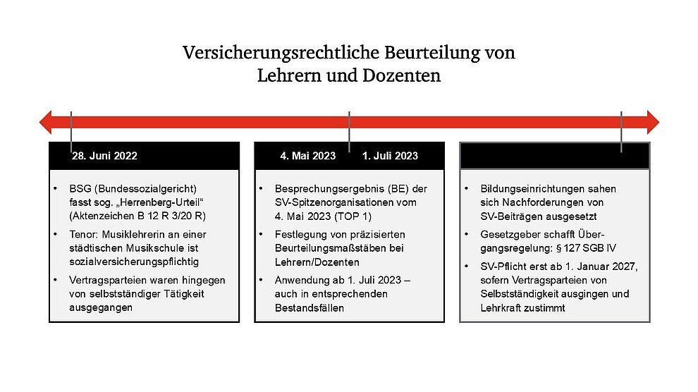 Das BSG-Urteil und in der Folge das Besprechungsergebnis der SV-Spitzenorganisationen führten zu Statusfeststellungen und zu Beitragsnachforderungen durch die Deutsche Rentenversicherung, die einen Sturm der Entrüstung bei den betroffenen Bildungseinrichtungen auslösten. Dies rief wiederum den Gesetzgeber auf den Plan, der mit dem Gesetz zur Verbesserung rehabilitierungsrechtlicher Vorschriften für Opfer der politischen Verfolgung in der ehemaligen DDR und zur Änderung weiterer Vorschriften vom 25. Februar 2025 eine Übergangsregelung für Lehrtätigkeiten zum 1. März 2025 in Kraft setzte.