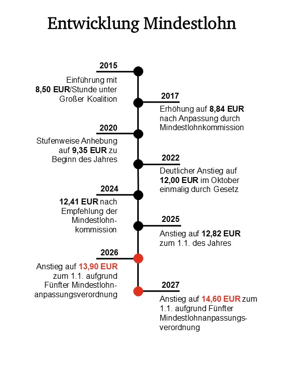 Die Mindestlohnkommission hat alle zwei Jahre über eine Anpassung der Höhe des gesetzlichen Mindestlohns zu beschließen (§ 9 Abs. 1 MiLoG) – heißt also bis zum 30. Juni 2025 für die Jahre 2026 und 2027. Am 27. Juni 2025 erfolgte der fünfte Beschluss mit einer Erhöhung in zwei Stufen (jeweils brutto je Zeitstunde):